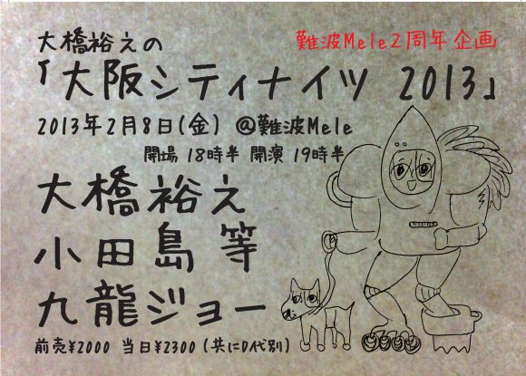 「シティライツ」でおなじみ、異能の漫画家大橋裕之のトークイベント「大阪シティナイツ」が約一年ぶりに難波Meleにやって来ます! 今回は「シティライツ」完結記念として「Quick Japan」「SPA!」などで活躍するライターの九龍ジョーと「シティライツ」の単行本カバーデザインを担当したデザイナー小田島等の大橋の盟友二人を迎えてのスペシャルなトークショー!一筋縄ではいかない三人のトークは必見です!他では聞けない裏話も飛び出すかも!?他にもスライドショーなどのオモシロコーナー満載です! 「シティライツ」が終わって寂しがってるアナタ!そんなアナタは是非お越しください!イベント終了後にはサイン会もありますよ!
